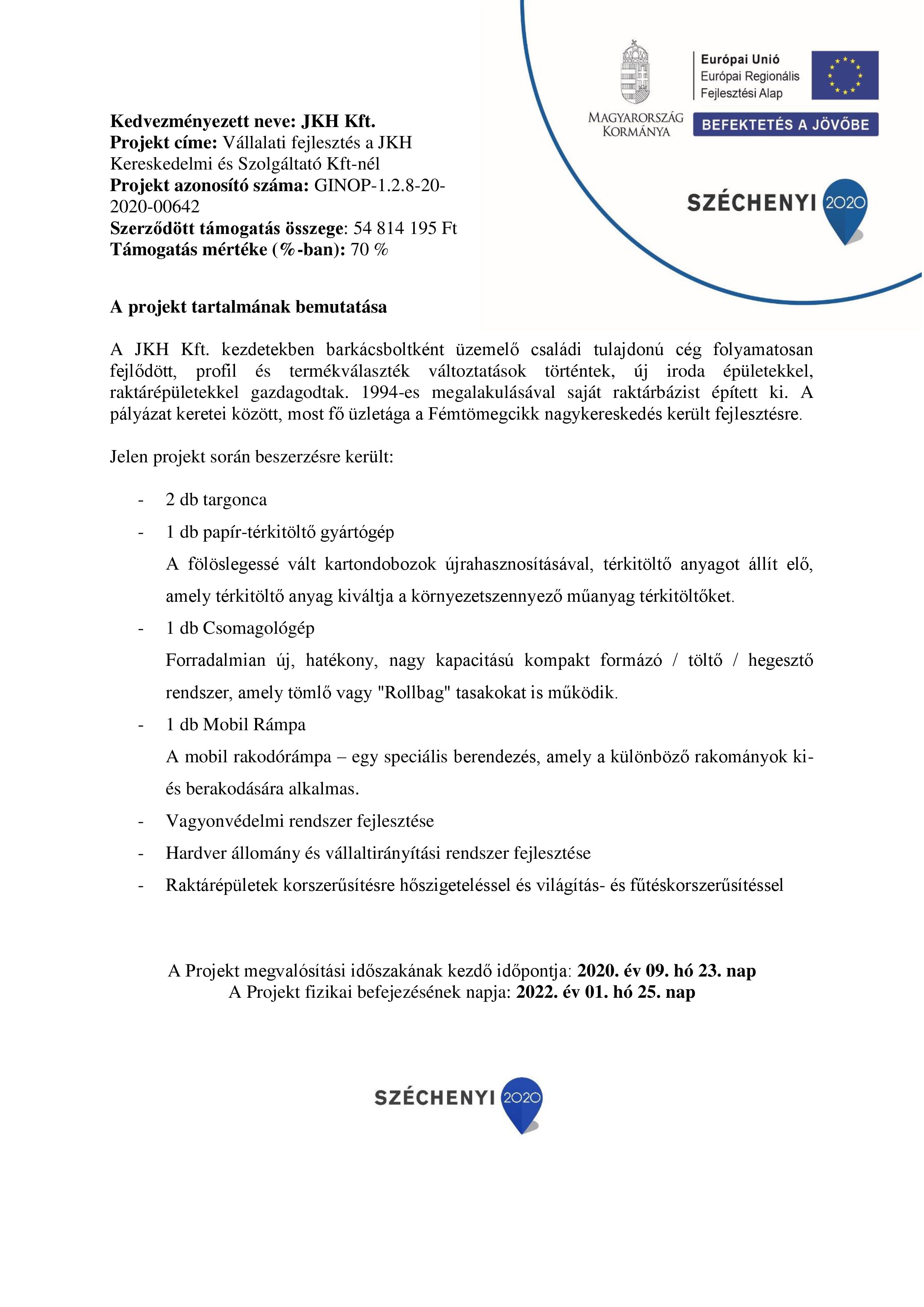 | Projekt neve: „Széleskörű fejlesztés a JKH Nagyker Kft-nél” |